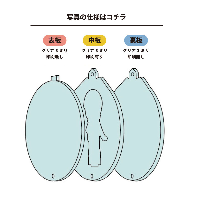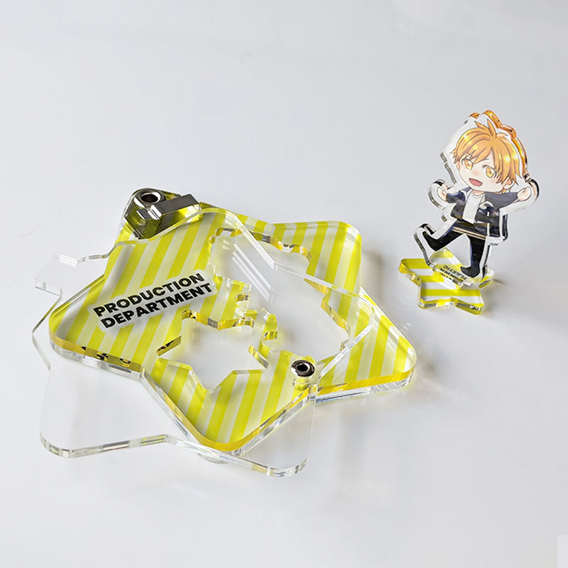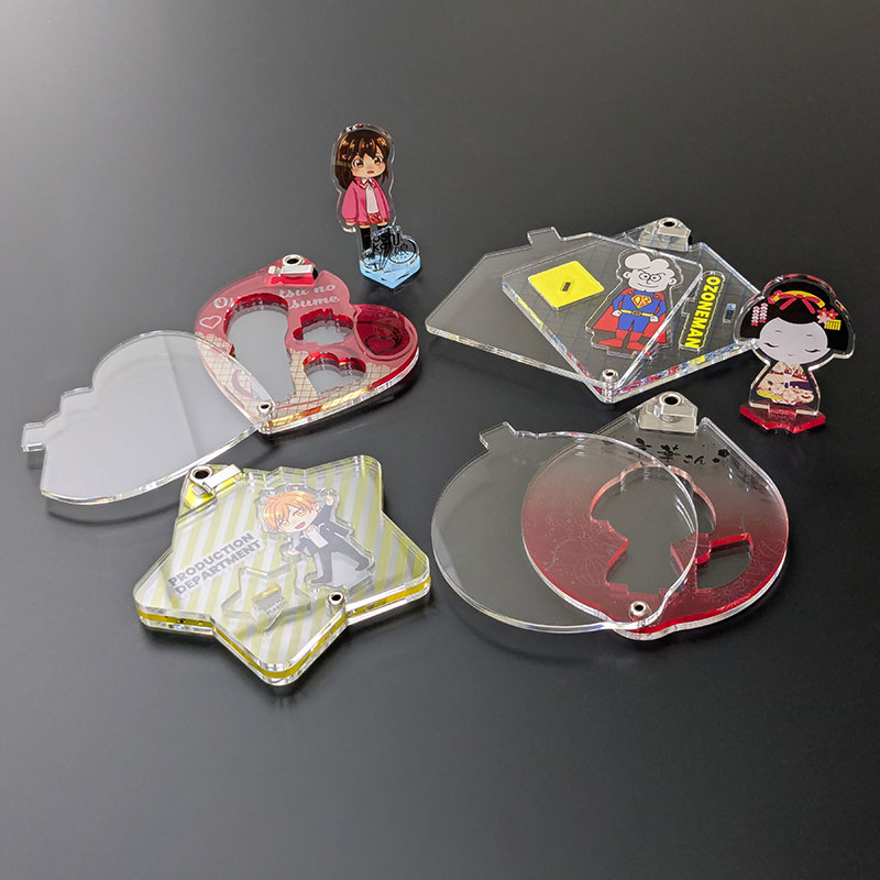 アクスタホルダーは上部の金具をすこし持ち上げ、表面をスライドさせるだけで開閉可能!戻す場合も金具がカチッとしっかり留まるので外れにくい構造になっています。ワンタッチで取り出すことができるのでとっても便利!アクスタホルダーはアクリルの3層で構成されており、すべての面に印刷が可能!透明度の高い国産アクリル板を使用。アクスタホルダーの構造は実用新案登録済(3249752号)です。