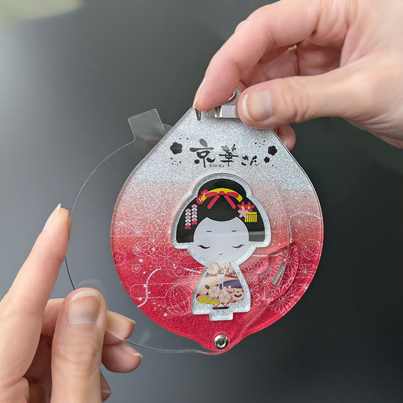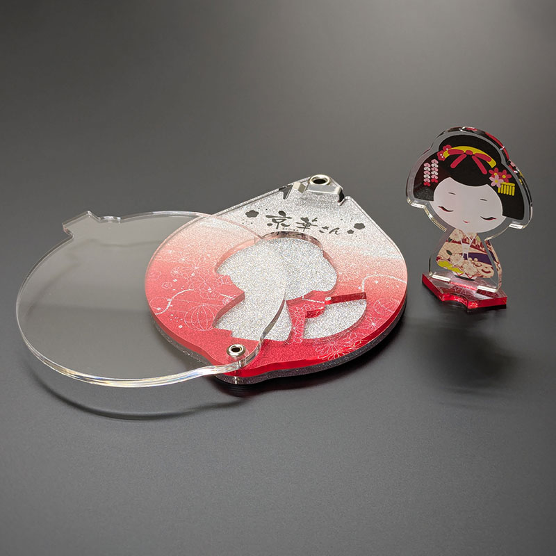 アクスタホルダーは上部の金具をすこし持ち上げ、表面をスライドさせるだけで開閉可能! 戻す場合も金具がカチッとしっかり留まるので外れにくい構造になっています。ワンタッチで取り出すことができるのでとっても便利!アクスタホルダーはアクリルの3層で構成されており、裏面以外に印刷が可能!後板へは細かなラメがきらめくグリッターアクリル板を使用。光を受けるたびに繊細なきらめきが広がり、デザインをより華やかにします。シルバーカラーで上品な仕上がりになります。 アクスタホルダーの構造は実用新案登録済(3249752号)です。※表・中板に印刷可能